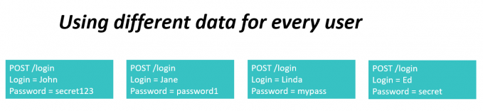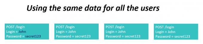 WebLOAD的自动参数化功能可确保您的脚本代表正确施加应用程序压力的各种用户和活动-自动替换文件中的日期、时间、字符串、整数或计划值,并处理这些值的唯一性。 无需参数化即可执行 录制时输入的用户为Login = John和Password = secret123。 如果不进行参数化,则所有4个用户都使用相同的值。